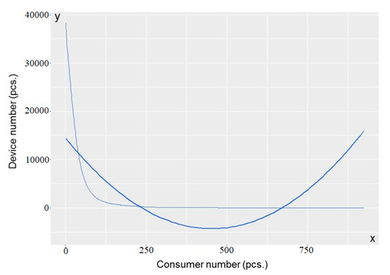 All coefficient of the function is statistically significant, and the function result explains the original data series in 99.93%. From a data analysis point of view, the function explains the result, and the correlation described by the parameters can be verified in the consumer number—device number function.