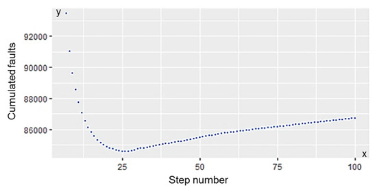 For the best alignment, the parameters are searched by non-linear optimization function (nlsLM) by R software. During the nlsLM iteration process, the software aligns the function to the dot series and finds the best fit solution with the continuous modification of the parameters using the Levenberg-Marquardt type algorithm [35]. Multiple iterations were performed when using the method. Firstly, the approximate value of the parameters was determined by the usage of nlsLM function, in a 50-step iteration. In the next round, these values were the input data for the nlsLM function. The experiment was run in 100 steps/rounds, accordingly the result was refined by a kind of Monte Carlo method. This was necessary, as the R algorithm performs only certain number of iteration cycle (Figure 6) where the number of rounds represented horizontally, while the cumulated fault vertically. As shown in Figure 6, running more iterations would not result in a continuous improvement of the results. The solution providing the least cumulated fault was chosen as the final outcome of the iterations.