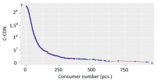 The main goal of the test was to figure out that how much profit would have been reached above a certain affected consumer number (consumer, C) by the installation of SSB. For example, if SSB would have been installed to all such nodes where the failure would have affected minimum 100 consumers. Another important parameter at the testing of the efficiency of SSB that how many such nodes exist (cumulative device number, CDN). The analysis provided two series of data as a final result: the correlation between the cumulated device number and the failure affected consumer number, as well correlation between the consumer number and SAIDI index [29]. The data series cannot be used further in their raw form, i.e., a function must be applied to them. The result of the function application is a new data representation which can be used during further researches and also by the electric industry [30].