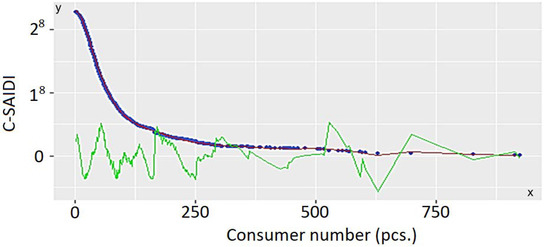 The original C-SAIDI data series (blue dots) and the C-SAIDI function (red line) and the difference between them in twenty magnifications (green line).
