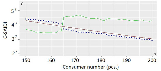 In the case of C-SAIDI and C-CDN, the divergence proportion between the function and the data series is higher by moving towards the extreme values. The reason for this is that fewer data are available at these points, and therefore the polynomial method provides a less exact alignment. Figure 8 and Figure 9 illustrate SAIDI (vertical) in the function of device number (horizontal).