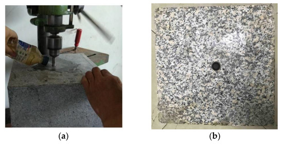 The following procedures used for the preparation of rock sample were shown in Figure 3: (1) The rocks were cut into 300 × 300 × 300 mm cubes with a perpendicularity of ±1°, surface tolerance of ±1 mm, the ones with higher homogeneity and more intact ones are preferred; (2) A borehole was drilled in the center of the rock’s surface, with the depth of 150 mm, and the wellbore bottom was in the center of the rock sample; (3) the wellbore was drilled at 700 rpm using a 15 mm masonry drill bit, to prevent drilling caused micro cracks around the wellbore, drilling was began as soon as the sample was removed from the water bath; (4) After the drilling, distilled water was used to flush the borehole until cleaning up all the rock debris in the borehole; (5) After the distilled water in the wellbore completely evaporated and the wellbore wall was dry, the epoxy grout resin adhesive was injected into the wellbore; (6) The water injection tube (Figure 3c) was a hollow stainless steel tube with a 10 mm outside diameter, a 160mm length, the tube was slightly roughened to provide a better bond between the tube, adhesive and rock and the maximum internal pressure that the tube could withstand is 60 MPa; (7) The injection tube was design to have two side holes for fluid to flow through to fracture the rock near the bottom; (8) A transparent plastic was sealed on the side holes to prevent the adhesive flowing into the injection tube, then the tube was pressed into the wellbore to be glued, 150 mm of the tube was stuck into the rock sample, the transparent plastic prevented adhesive flowing into the tube; (9) 10 mm of the tube, as a water injection hole, was exposed outside the rock sample, then water flowed into the rock through the exposed part, when the water was pressured into the tube, the plastic fails, and water flowed into the rock; (10) After the injection tube and rock were glued, they were placed at room temperature for more than 48 hours, so that the tube and the rock were completely bonded.