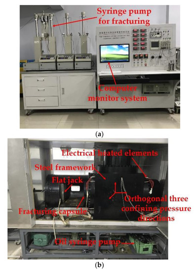 The tests were conducted on a true-triaxial hydraulic fracturing apparatus that was developed by Jiangsu Nantong Petroleum Instrument Co. Ltd and the Environment and Groundwater Resources Education Ministry Key Laboratory in Jilin University. The fracturing apparatus has two advantages, one that it has a heating device to provide temperature high enough to simulate the enhanced geothermal system (EGS) temperature environment, the other one is that it could provide triaxial principal to simulate in situ stresses. The apparatus main components are shown in Figure 4. It consists of four sub-systems: a water injection system, a heating system, a steel framework and confining pressure system, and a computer monitor system.