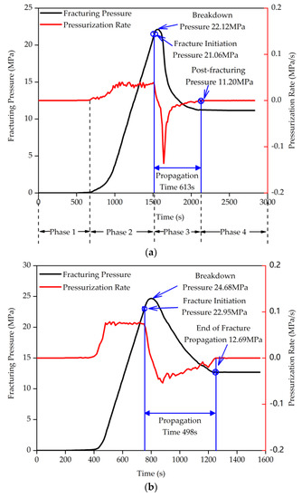 - A particular pressure–time curve could be divided into four main phases: initial pressure development stage, wellbore pressurization stage, fracturing phase, and post-failure stage. The pressurization rate curve could help to distinguish the four phases. Four parameters of the fracture initiation pressure, propagation time, post-fracturing pressure, and breakdown pressure could be obtained from the pressure–time curves. The injection flow rates significantly influenced these four parameters during hydraulic fracturing. The initiation pressures and breakdown pressures have approximately linear positive relations to injection flow rates. The post-fracturing pressure and propagation time had approximately linear negative relations to injection flow rates.