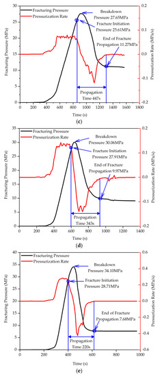 In laboratorial hydraulic fracturing tests, the fracture propagation time is usually the time interval that it takes from the fracture initiation until it grows all the way to the boundary of the experimental sample from the wellbore bottom. After a fracture is triggered, the fracture grows, more and more new volume will be induced, and the wellbore pressure decline rate will accelerate. This is shown in Figure 8, where wellbore pressurization rated (red curves) are decreasing after the fracture initiation points. It could be considered to be the beginning of the fracture propagation. When the fracture reaches the sample boundaries, the fluid begins to flow out into fracturing capsule from the fractures. The pressure in the wellbore is now equal to frictional pressure that the fracturing fluid loses along the fracture pathway. As the fracturing pressure is stable and does not change with time and the pressurization rate becomes zero without fluctuation. This is the time point (see Figure 8) that could be practically considered as the fracture propagation ending, and the remaining the pressure–time data represent the new injected water flowing via the fracture pathway. Through the pressurization rate curve, we can easily determine the propagation time. The fracture propagation time (see Figure 8) could be considered as the time interval between the fracture initiation and the fracture end.