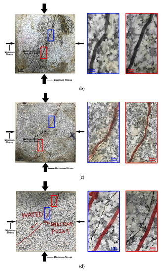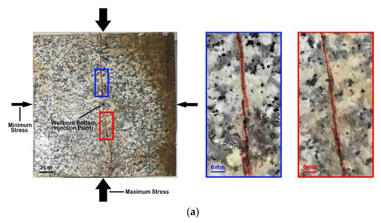 - Zhuang, L.; Kim, K.Y.; Jung, S.G.; Diaz, M.; Min, K.B. Effect of Water Infiltration, Injection Rate and Anisotropy on Hydraulic Fracturing Behavior of Granite. Rock Mech. Rock Eng. 2019, 52, 575–589. [Google Scholar] [CrossRef]