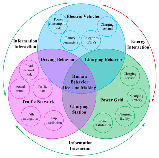 As the carrier of transportation and moveable loads, EVs motivate their driving behavior to interact with the traffic network, mainly in the form of information interaction, and motivate their charging behavior to interact with the power grid in the form of energy interaction. Also, the power grid and traffic network realize the coupling of network nodes in the form of information interaction through charging stations. Furthermore, human behavior decision-making is the source and guidance for driving behavior and charging behavior.