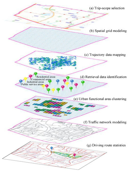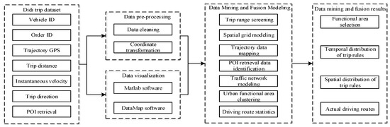 Visualization of the original trip data cannot reveal the resident’s trip rules and traffic operation characteristics. Therefore, it is necessary to conduct modeling analysis through data mining and fusion technology. The technical structure is shown in Figure 3.