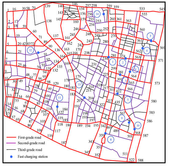 The traffic network model of third-grade roads and above in the selected area was built, and 14 commercial EV fast-charging stations in operation in the region were also analyzed to predict load demands. The structure topology of the traffic network and the distribution of fast-charging stations are shown in Figure 4, wherein geographical location information of each fast-charging station is shown in the Appendix A (Table A3). As depicted, there were 588 traffic nodes and 456 road segments in this area. The basic road planning data can be found on the OpenStreetMap website.