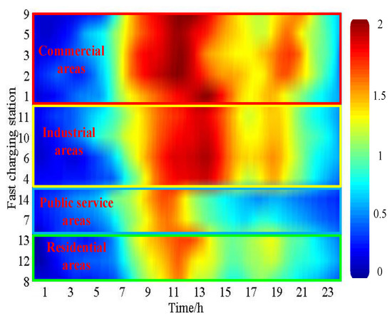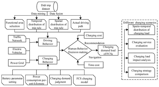 However, the driving and charging behaviors of numerous EVs in urban internal networks are bound to interact with the energy and information generated by the traffic network and power grid [7,8]. The residents’ trip rule, urban road network structure and charging facility distribution affect the vehicle driving distribution and charging selection, whereas the vehicle battery parameters, driving path plan and human decision-making behavior also affect the degree of traffic network obstruction and the power grid operation state [9,10,11,12]. Therefore, accurate prediction of EV charging demand and reasonable fast-charging station (FCS) recommendations are the premise of realizing compatibility between EVs and the power grid along with the transportation network.