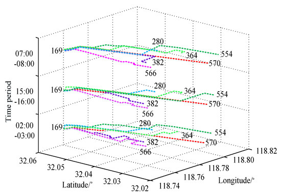Through applying from the official website, we obtained part of trip data sets in Nanjing, China, whose time spanned from 1 June 2016 to 31 June 2016. These data sets contain a total number of 31 data packets in days, with an average sampling interval of 3 s, and include 474,590 trip data chains. The main data formats and examples of trip data are shown in the Appendix A (Table A1 and Table A2).