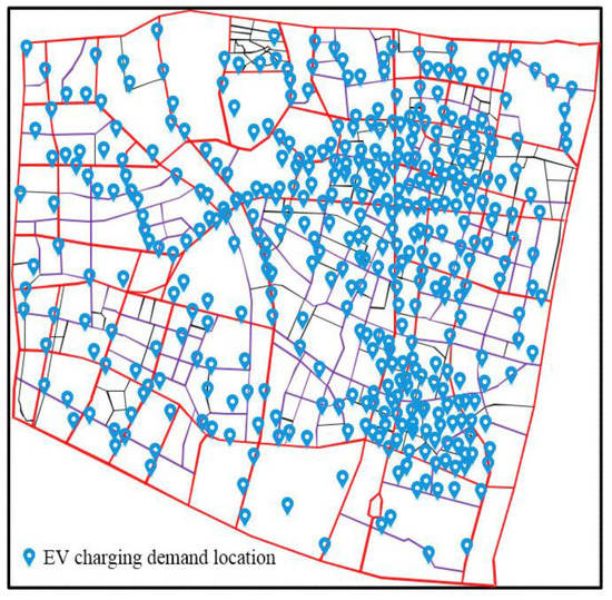 At present, various studies have developed EV charging demand models from the aspect of cooperation between EVs, the transportation system and power system all together. Hence, in [13,14], an origin destination (OD) matrix analysis method was utilized to track the all-weather driving trajectory of EVs and to predict the charging load distribution of the regional electricity grid as well as the flow status of road networks through vehicle traffic trip demands. Several studies [15,16,17] introduced Traffic Trip Chain and Markov Decision Chain to simulate the dynamic driving behavior and random charging behavior of EVs, established a dynamic EV charging demand prediction model and evaluated the congestion degree on the distribution network and traffic network caused by large-scale aggregation charging. In addition, researchers [18,19] adopted a microscopic traffic model to depict the dynamic characteristics and electrical state of EVs in the joint simulation system of transportation electrification, and they predicted the evolution trend of vehicle traffic demand and charging demand. Further, traffic nodes and electricity nodes in heterogeneous physical space were mapped to networks in studies [20,21]. The driving behavior in traffic topology and charging behavior in distribution network topology were coupled to network modeling, and a ‘vehicle–road–network’ integration system was constructed. This system was capable of analyzing the charging demand distribution, traffic flow status and effectiveness of implementing a charging scheduling strategy.