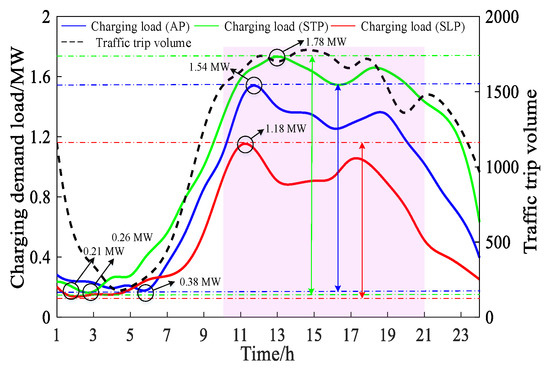 We directly applied the data analysis and statistical results from [37], that is, the temporal distribution of departure time in the set and arrival time in the set had altered dates. Notably, the trip demand on weekdays was more than that on weekends and holidays. The traffic volume was mainly concentrated in the morning and evening peak hours, and that was significantly reduced at night.