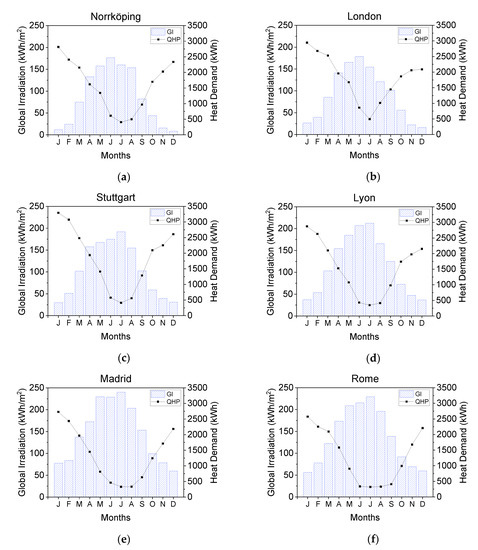 - Bee, E.; Prada, A.; Baggio, P.; Psimopoulos, E. Air-source heat pump and photovoltaic systems for residential heating and cooling: Potential of self-consumption in different European climates. Build. Simul. 2019, 12, 453. [Google Scholar] [CrossRef]