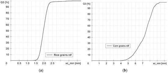 Rice and corn grains that are unsuitable for food purposes due to having been stored in inappropriate conditions that were used for the production of pellets underwent grinding in the experimental tests, verifying the correctness of the integrated energy consumption model. Both crops are extensively grown, and both of them have found applications in the energy sector due to their good energy characteristics, which make them suitable for the production of pellets whose calorific value is similar to that of a wooden biomass [80]. Grain moisture was determined on a moisture balance MAC 210/NP (RADWAG, Radom, Poland) by means of the weight method. Rice grains were characterized by moisture at the level of 13.47% ± 0.02%, whereas corn was at the level of 12.68% ± 0.02%. The characteristic dimension of grain D80 for corn was 8.15 mm and, for rice, 2.14 mm (Figure 1). These values were obtained on the basis of a granulometric analysis carried out on a Camsizer (Retsch Technology GmbH, Haan, Germany) design according to the ISO norm 13322-2:2006 [81].