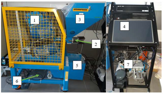 Test stand for the intelligent monitoring of granular mass characteristics: 1—five-disc grinder, 2—worm feeder, 3—hopper, 4—control unit, 5—reception basket of the product of grinding, 6—weight of the product of grinding, and 7—integrated system for the analysis of the grinding product’s particle size [28].
