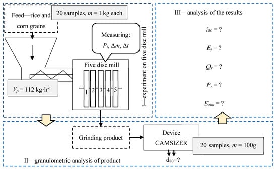 Research plan. Vp—feed dosing capacity, Pi—power consumption on the i-th disc, ∆m—mass increase in the intake hopper, d80—dimension of the sieve hole through which 80% of the grinding product passes, i80—80% fragmentation degree, Ej—unit energy consumption, Qr—yield of grinding, Pr—power consumed by the grinder, and Ezint—integrated energy consumption.