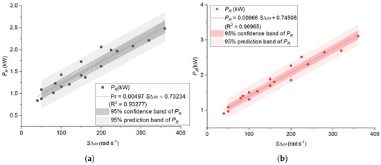 On the basis of the Shapiro-Wilk test (Appendix A, Table A1 and Table A2) and the values of skewness and kurtosis (Appendix A, Table A3 and Table A4) of the distribution of the power consumption test results, it was found that this distribution is approximately normal. Subsequently, the Pearson method was used for the analysis of correlation between the power consumption of grinding PR and total speed increase S∆ω. Correlation analysis revealed that there was a strong relation between the power consumption in grinding PR and a total speed increase S∆ω during both rice grinding (R = 0.9658, Appendix A, Table A5) and corn grinding (R = 0.9847, Appendix A, Table A6).