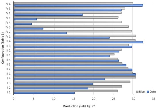 Figure 6 shows the results of rice and corn grinding yield tests performed on a five-disc grinder. The results indicate that the disc angular speed changes have an impact on this parameter change. As in the case of power consumption, it was observed that grinding yields increased along with an increase in the disc angular speeds. It could also be observed that, for the settings of the grinder disc angular speeds at which the first disc speed was the lowest, the rice grinding yield was significantly higher than that of the corn (Figure 6). For the remaining settings, the yield was similar though slightly higher for corn. This might result from the relations between the structural characteristics of working discs, speed, and the size of the grain used. The average size of rice grains was definitely lower than that of corn; hence, more of them can be introduced into the open space of the grinding discs.
