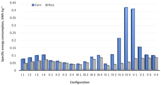 Figure 7 shows the test results of the unit energy consumptions for rice and corn grain grinding. For all the considered settings of the five-disc grinder angular speeds, the unit energy demand was higher for corn grinding (Figure 7), which was mostly connected with a higher power consumption during corn grinding, which, in turn, results from the grain strength properties which are discussed in Section 3.1.1. Earlier research also indicated a higher unit energy consumption for corn grinding [19]. The results indicate that an increase in the angular speed of discs caused an increase in energy consumption (Figure 7).