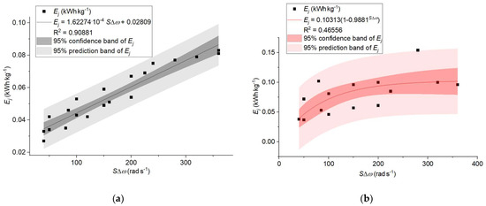 On the basis of the Shapiro-Wilk test (Appendix A, Table A1 and Table A2) and the values of skewness and kurtosis (Appendix A, Table A3 and Table A4) of the distribution of the results of the unit energy consumption tests, it was found that this distribution is approximately normal for the grinding of rice, while for the grinding of corn, it deviated from normal. Subsequently, the Pearson method was used in an analysis of correlation between unit energy consumption Ej for rice grinding and total speed increase S∆ω; whereas, in the case of corn, the Spearman method was used to assess these relations. Correlation analysis showed that there was a very strong positive correlation between the unit energy consumption Ej and total speed increase S∆ω for rice grinding (R = 0.95332, Appendix A, Table A5). In the case of corn grinding, the correlation of these two variables was moderate (R = 0.5963, Appendix A, Table A8).
