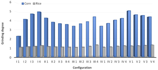 Earlier analyses of rice and corn strength indicated that higher forces are needed to grind corn grains, which is reflected by the power demand of grinding machines, due to the necessity of overcoming the higher resistance of moving elements [37]. An increased demand for power and energy in the case of a higher-strength grinding material was confirmed by [38,39,40], among others. An increased demand for power for corn grinding is also the effect of differences in the internal structure thereof [38,39,40]. Rice grains deprived of husks were used in the tests, whereas corn grains had the seed coat. Moreover, corn grains differ from rice grains in terms of endosperm structure. Grains with higher endosperm glassiness have been observed to need more energy and power in the process of grinding [36,41,42].