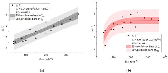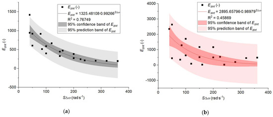 In the case of the unit energy consumption involved in corn grinding, after the removal of outstanding values (results for settings IV3, IV4, and V1), it was the exponential model that provided the best match (Figure 8b) when compared to the others. This model was chosen on the basis of a ranking of the different nonlinear models. As a selection criterion, the value of the model match coefficient R2 (the higher the value, the better the model) and the value of the standard error of the model coefficients (the lower the error, the better the model) were used. Unfortunately, the chosen model explained the variability of the unit energy consumption as a function of the total speed increase merely partially—slightly over 46% of the variability was explained by means of the chosen function. Both the coefficients in the equations and the regression models were statistically significant (Table 6 and Table 7). The standard error of the coefficients in the equations did not exceed 12%.