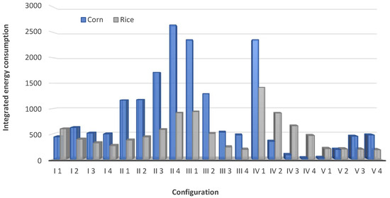 In this part of the study, the test results of the integrated energy consumption index variables are described along with an analysis of their relations with the independent variable: the increase in the grinder disc angular speed S∆ω. The results of the tests performed for the settings of the accepted grinder disc angular speed configurations for rice grinding are presented in Table S1 and, for corn, in Table S2.
