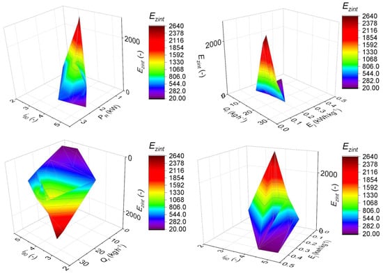 Bearing in mind dependences (11)–(14) and (22), integrated energy consumption depends, in direct proportion, on the yield and fragmentation degree and, in an inverse proportion, to the power consumption and unit energy demand. Assuming that the state to be desired is that in which Q→ ∞, i80→ ∞, Pr→ 0, and Ej→ 0, then Ezint→ ∞. In the sustainable approach, a better process will be the one with a higher integrated energy consumption index value (22).
