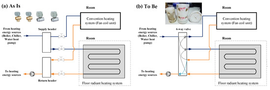 Table 1 are basic modes that operate by convection and radiation, respectively. In the different modes, the hot water flows to the convector or floor radiation panel, respectively. Mode 3 is an operation mode for units where intermittent heating is performed, such as in single-person residences. In Mode 3, hot water passes through the convector and flows into the floor radiation panel. Mode 4 is opposite to Mode 3, hot water flows into the floor radiation panel first and then into the convector.