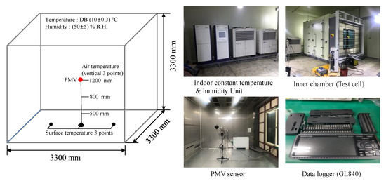 Figure 5 illustrates that the measurement was conducted in a test cell, 3300 mm (D) × 3300 mm (L) × 3300 mm (H) in size. The U-value of the wall was 0.15 W/m