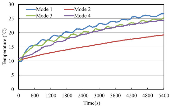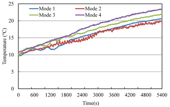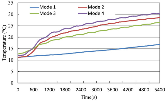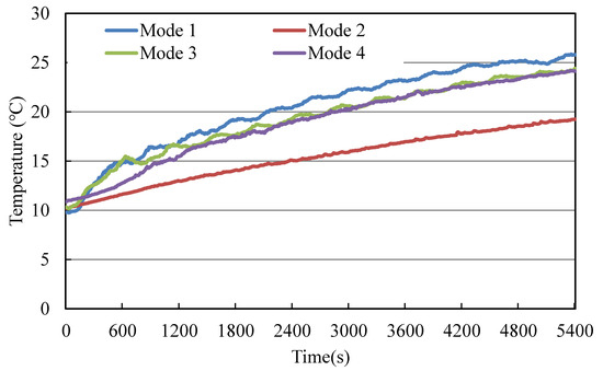 Figure 8 shows the air temperature at 50 cm above the floor. Mode 4 showed the highest air temperature, whereas Mode 2 showed the lowest air temperature. The air temperature at 50 cm above the floor was higher in Modes 3 and 4 than in Modes 1 and 2.