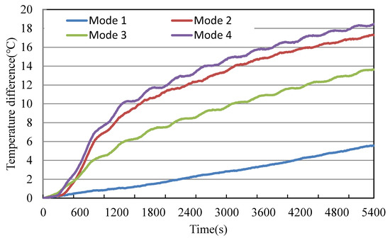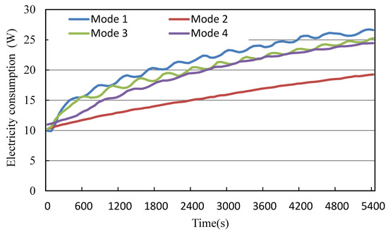 Table 6 shows the electric energy expended to raise the indoor air temperature by 1 °C up until 90 min when the heating system’s operation was complete. Mode 2 consumed the most energy in order to raise the indoor air temperature by 1 °C. Modes 1, 3, and 4 showed similar energy consumption rates.