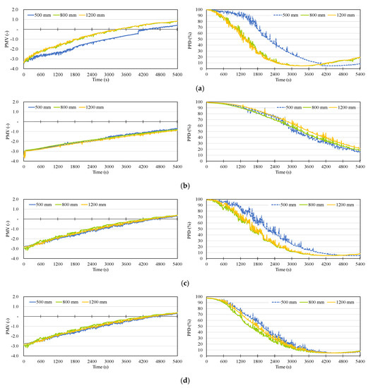 Figure 11a shows the result for the PMV and PPD variations in Mode 1. A comparison of these three PMV variation curves shows that the PMV were higher at 80 cm and at 120 cm than at 50 cm, and at 80 cm and at 120 cm the PPD was dramatically decreased to the range recommended by ISO 7730 with PPD < 10%.