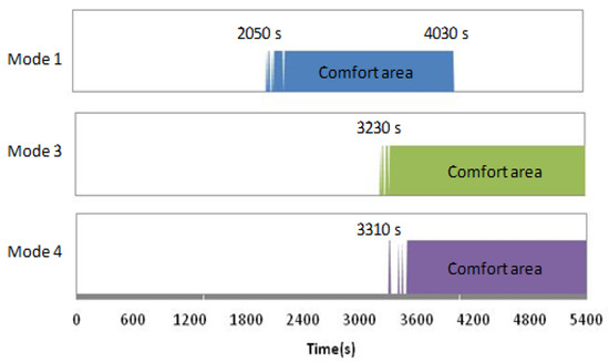Figure 12 shows the time slot of each mode in which the PMV is in the comfort area. When the PMV value is in the range of −0.5 to +0.5, the human body feels thermally comfortable. The indoor thermal environment entered the comfort area earliest in Mode 12,050 s after heating began; however, the room became overheated and exceeded the comfort range at 4030 s. This is because the results for the same operation time were used to understand the characteristics of each mode. In Modes 3 and 4, the indoor thermal environment entered the comfort area after 3230 s and 3310 s, respectively, and it was maintained until 5400 s. In the case of radiant floor heating, the indoor PMV value stayed below the comfort area until after 90 min.