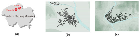(a) Location of sample villages and the layouts of (b) Heyang and (c) Danzhi.