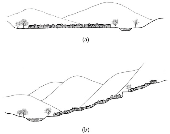 Figure 1a,c, is located in the hilly western area of Jinyun County, backed by hills in the northeast and surrounded by water on three sides. It has an average elevation of 260 m. The village is located in the foothills of a mountain and has been constructed partially up the side of this mountain. Due to its relatively limited communication with the outside world, this village has retained the traditional dwellings that are unique to the local ecology.