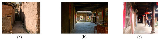 (2) Courtyards: To manage the year-round high humidity, summer heat, and typhoons, the dwellings in the two subject villages have typically adopted a layout with a small inner courtyard. This arrangement is able to cope with the variations in the external climate. Isolation from the external environment allows for insulation and dehumidification; thus, the environment inside the courtyard is used to adjust the microclimate of the dwelling. By forming an enclosed microenvironment, the indoor and outdoor temperature difference generated by solar radiation creates thermal pressure. The draft created by this thermal pressure removes heat and extracts the hot and humid air from the rooms, reducing the indoor temperature. In the summer, the courtyard blocks sunlight and reduces the solar radiation entering the rooms, reducing the air temperature in the courtyard to provide a cooler space. The space above the courtyard is exposed to the sun, so the temperature above the courtyard is higher than that inside the courtyard; as the hot air rises, the pressure in the courtyard is reduced and generates a draft in the surrounding dwelling. The interior hot air flows out into the courtyard and creates a stacking effect. The courtyard, therefore, not only promotes dwelling ventilation but also has a cooling effect (