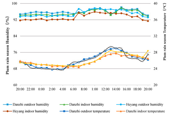 Average temperature and RH in Heyang and Danzhi villages over 24 h during the plum rain season.