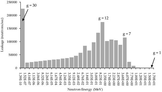 where is the external surface area of the PERP ball. Figure 1 shows the histogram plot of the leakage for each energy group for the PERP benchmark. The total leakage computed using Equation (6) for the PERP benchmark is neutrons/sec. Table 2 summarizes the integrals for the source, fission source, absorption, in-scattering, self-scattering, out-scattering, and particle balance.