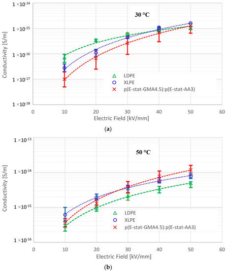 It can be observed that the DC conductivities of all three materials obey a power-law type dependency on electric field within the tested temperature and electric field ranges. At the lowest field and temperature (10 kV/mm, 30 °C), the conductivity values are of the order of 10−17 S/m. When the field and temperature reach the highest values (50 kV/mm, 70 °C), the conductivity increases by almost three orders of magnitude for all cases. These conductivity values are in good agreement with the earlier reported values for LDPE and XLPE [2,18,25,26]. The average conductivities of the copolymer blend at 30 °C are lower or nearly the same as compared to that of LDPE and XLPE for the entire range of the electric field. At 50 °C, their values are 1.3–2.6 times higher than for LDPE, but almost the same as for XLPE. The same characteristics can be observed even at 70 °C at an electric field strength of up to about 30 kV/mm. However, when considering the variations in the measured data (error bars), one can conclude that that the copolymer blend has almost the same conductivity level as XLPE for all studied temperatures (30–70 °C) and field levels (10–50 kV/mm), which cover normal operating points of high voltage power cables.