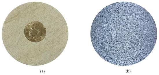 To determine the rock elastic properties (Young’s modulus and Poisson’s ratio) for simulation inputs, the uniaxial compression test was conducted in the sandstone sample (about 2″ Diameter × 2.2″ Thickness) following the ASTM D 2938 [7]. We cut the sandstone cores and polished it using a wheel (7″ Diameter) made with nickel-coated diamond grit and synthetic resin bond to get the finest flat ends (Figure 1) and meet ISRM [42], ASTM D 3967 [43], and ASTM D 2938 [7]. The sample properties are listed in Table 1 [41]. To remove all pore fluid, the sample was kept in a vacuum oven at 115 F for 24 h.