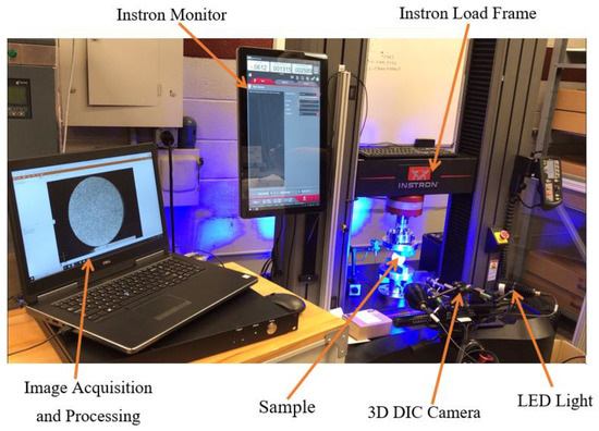 Firstly, at no-load condition, the reference images were taken for calibration purposes. After checking the calibration parameters, the cameras were fixed to capture two images per second during the entire test keeping at a constant displacement rate of 0.05 mm/min. Two blue LED lights were positioned in front of the Instron load frame. The lights were kept at an equal height with the sample to make sure the specimen speckled pattern was clearly recognized by the DIC camera. According to the ASTM D 3967 [43], the specimen fails in about 5 min, which fell within the suggested time frame of 1–10 min.