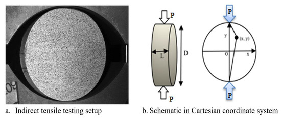 In Brazilian testing, a cylindrical specimen disc is compressed diametrically (Figure 4a,b). The assumptions [6] are given below: