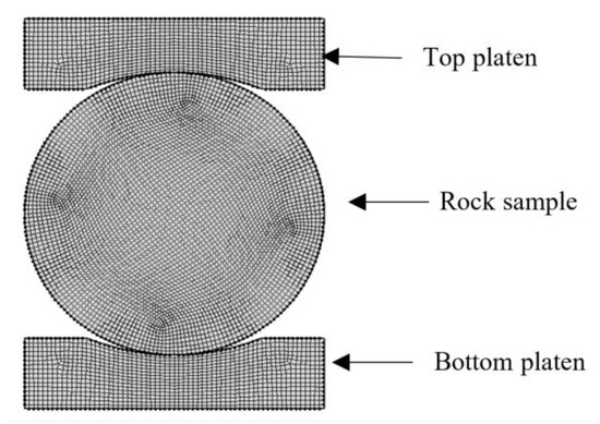 Figure 5 shows the element and nodal distribution for the Brazilian disc and loading platens. The free quadrilateral mesh was used to define the shapes and boundaries of finite elements and continuous deformation. For this BDT simulation, a load was applied to the rock sample through the upper platen with a constant or variable loading rate over time. Stresses (σx and σy) at any moment can be expressed by Equations (2) and (3), under a known loading P or loading displacement. There are two types of loading platens, which are used very commonly, flat platens and curved platens. In this paper, we applied curved platens in the simulation model, based on our real experimental conditions.