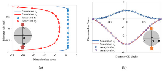 For any point (x, y) in the sample in a Cartesian plane (Figure 4b), the analytical stresses solutions in the x-direction (σx) and y-direction (σy), and shear stress, (τxy) can be expressed by the following equations, respectively [47],