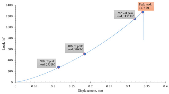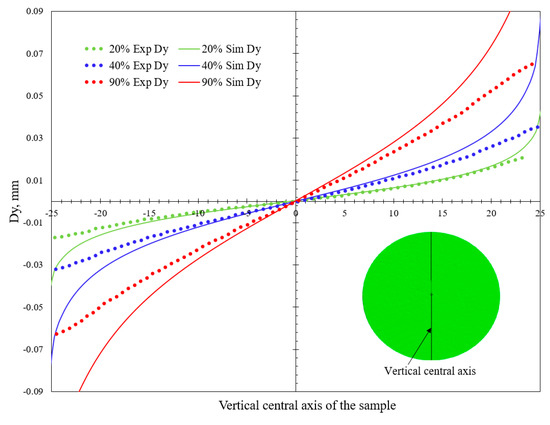At three different portions of applied peak loads, the changes in displacement along the central vertical axis during loading were also investigated to understand the deformation behaviors and compared with results from the numerical model which were presented in terms of displacement contour in Figure 11.