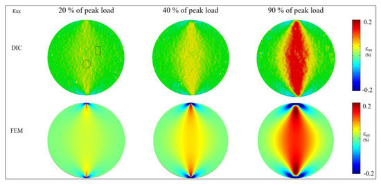 Both the DIC and FEM deformation patterns were very similar for 20% of the peak load in the vertical strain map shown in Figure 9. At 40% and 90% of the peak load, the strain maps showed some blue horizontal irregular lines, which probably occurred due to the compression of the soft lamination inherently present in the rock. The deformation of 90% of the peak load reasonably matched with the homogeneous simulation.