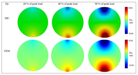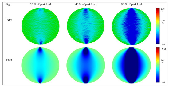 Similarly, vertical strain (εyy) distribution for three different peak loads also obtained from DIC was compared with the simulation results, which were presented in Figure 9. The strain range was selected to get the maximum visibility of the deformation behaviors. The vertical strain (εyy) distribution also matched close to the DIC generated value.