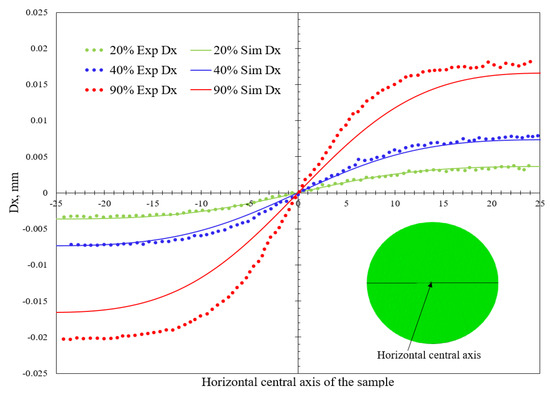 From Figure 8, good agreement was demonstrated between horizontal strain distributions from both DIC and the model. The simulation results showed that compressive strain was generated near the loading point or boundary, which was relatively less visible in DIC as it could not compute deformation up to half subset size near the boundary of the speckled region. The results also substantiated there was a reasonably good match obtained within the elastic response (20% and 40% of peak load). As the load increased and the sample reached closer to failure, the deviation in deformation along with the centerline increased as shown for 90% of the peak load.